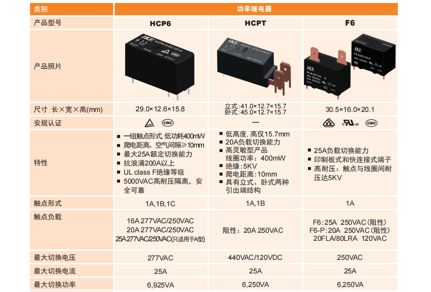 功率继电器 F6 特性: ■25A负载切换能力 ■印制板式和快连接式端子 ■高耐压:触点与线圈间耐压达5KV